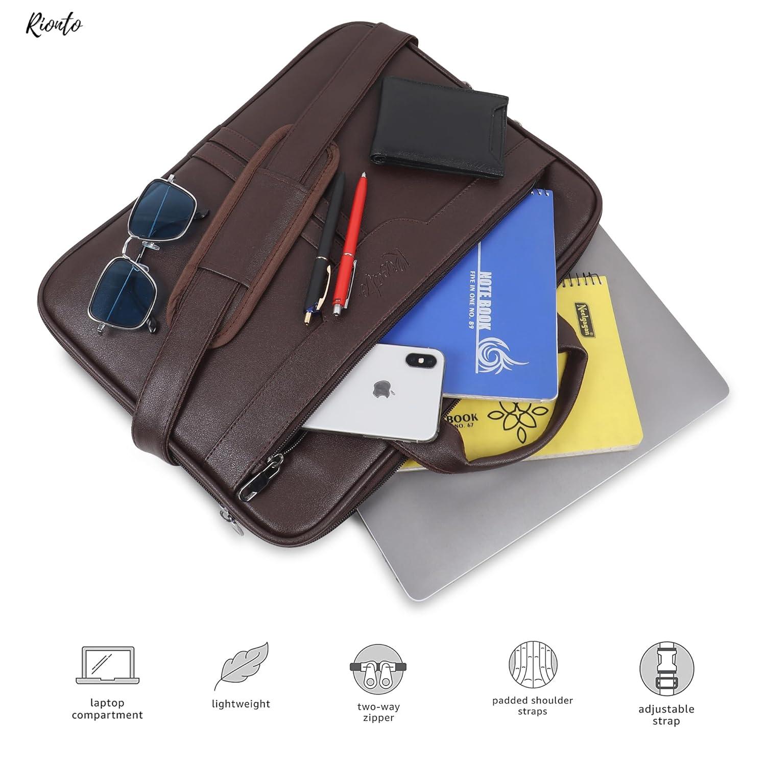 With adjustable shoulder strap, smart, unisex design, & stylish leather fabrication, Rionto Prime is also perfectly versatile: men’s office messenger, women’s laptop sling bag, and everyday messenger. Its chic brown finish ensures versatility & durability for all professional scenarios.